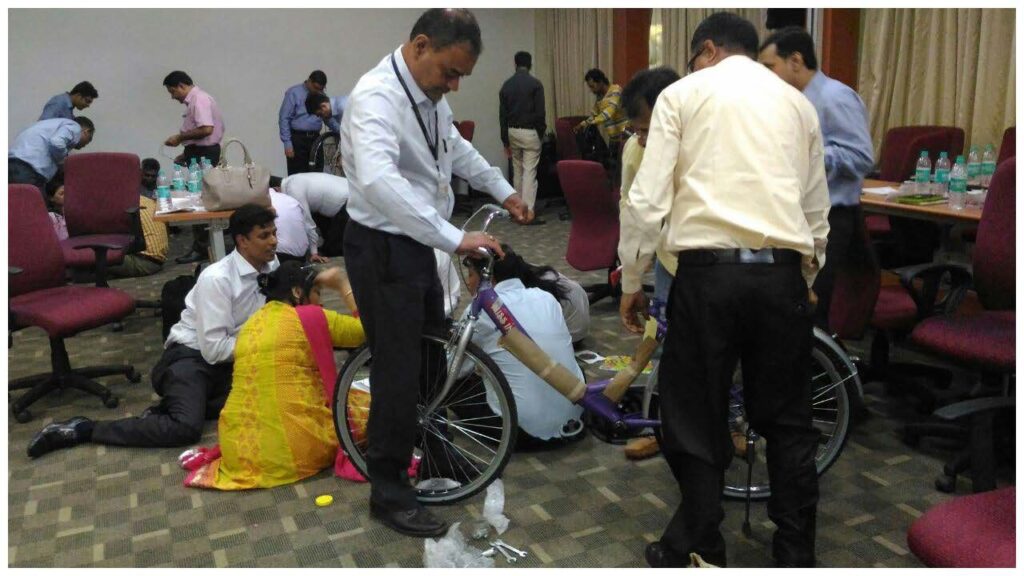 Finally, they see purpose. Participants are informed that their bikes would be donated to underprivileged children, who would risk their life traveling to school on bumpy roads. Would you still trust the quality of your work? A whole new purpose dawns upon them as we see them asking for more time to add finishing touches and tightening loose screws to make it road-worthy and not just a make-shift, day-worthy bike.